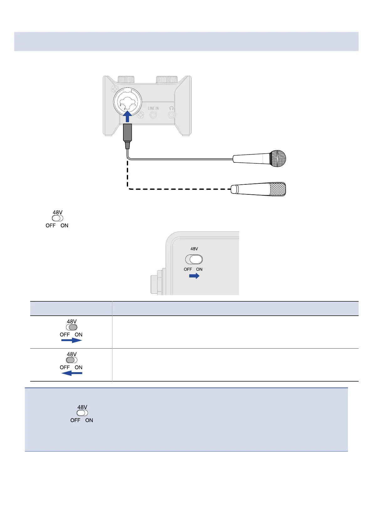 • Do not set to ON when connecting equipment that is not compatible with phantom power.