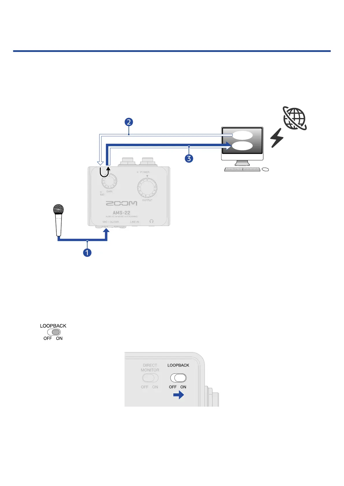By turning the LOOPBACK function ON, sound input through the AMS-22 MIC/GUITAR jack and sound