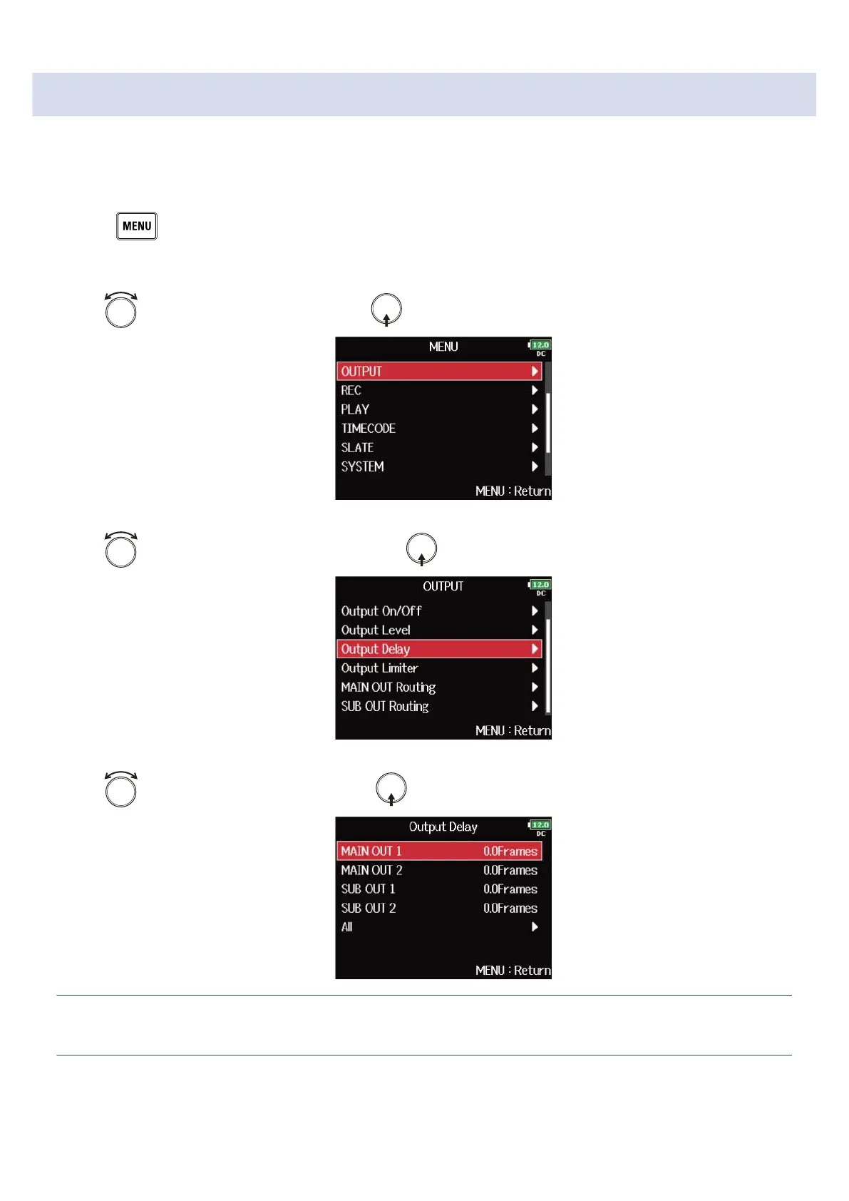 By delaying audio outputs, you can correct timing differences for signals input to other devices from the
