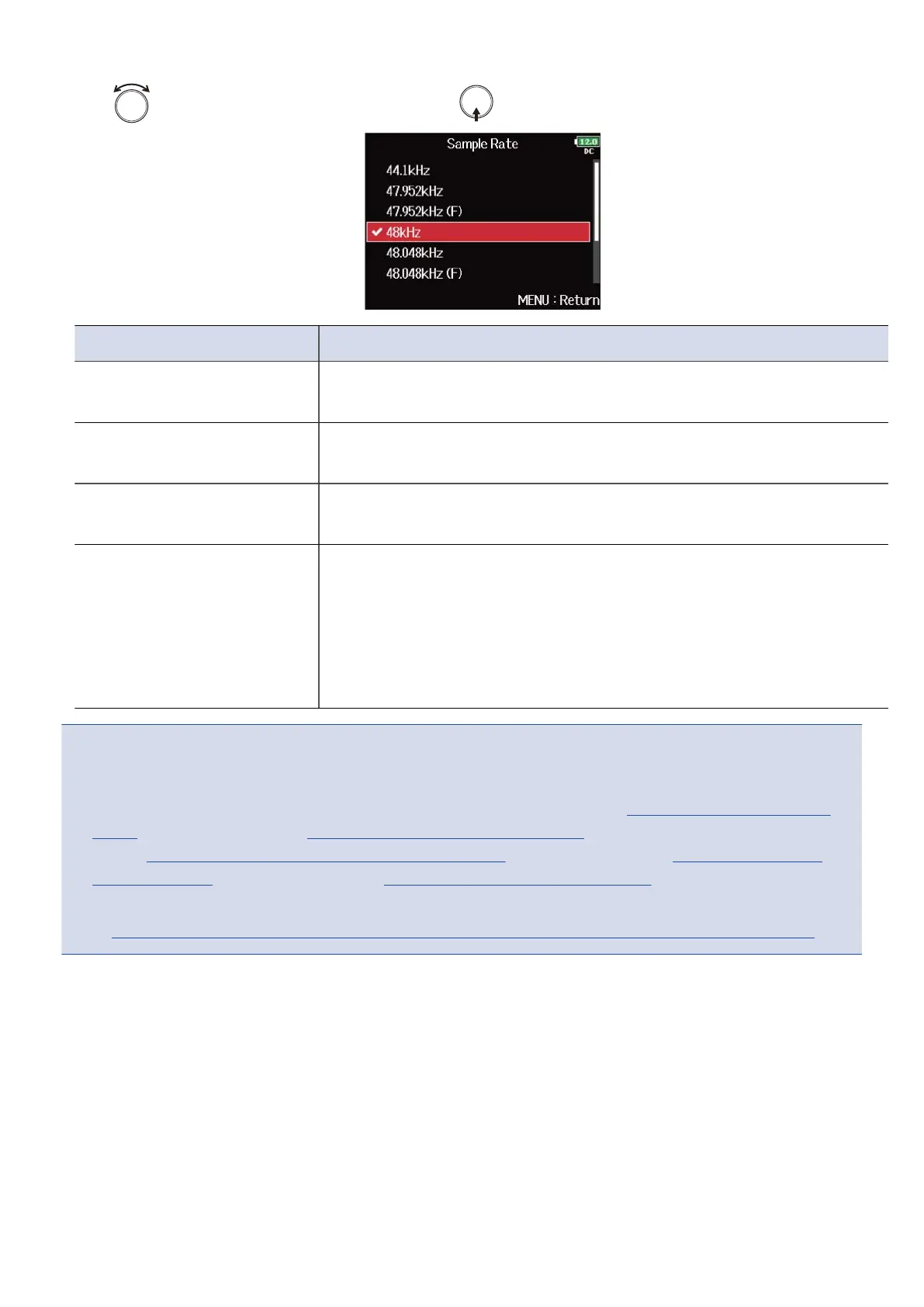 • When the recording file format is MP3, only 44.1 kHz and 48 kHz can be selected.