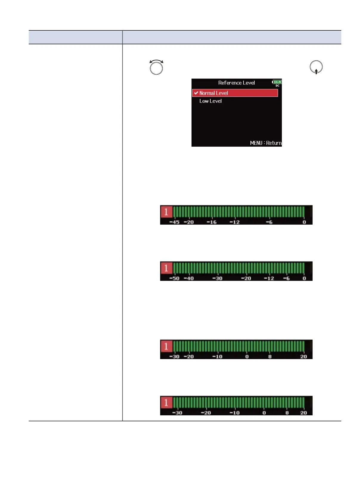 • Low Level: The center of the level meter is -20 dBFS. Clear