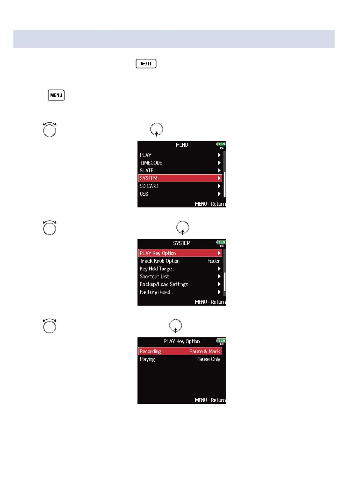 3. Use to select “PLAY Key Option”, and press .