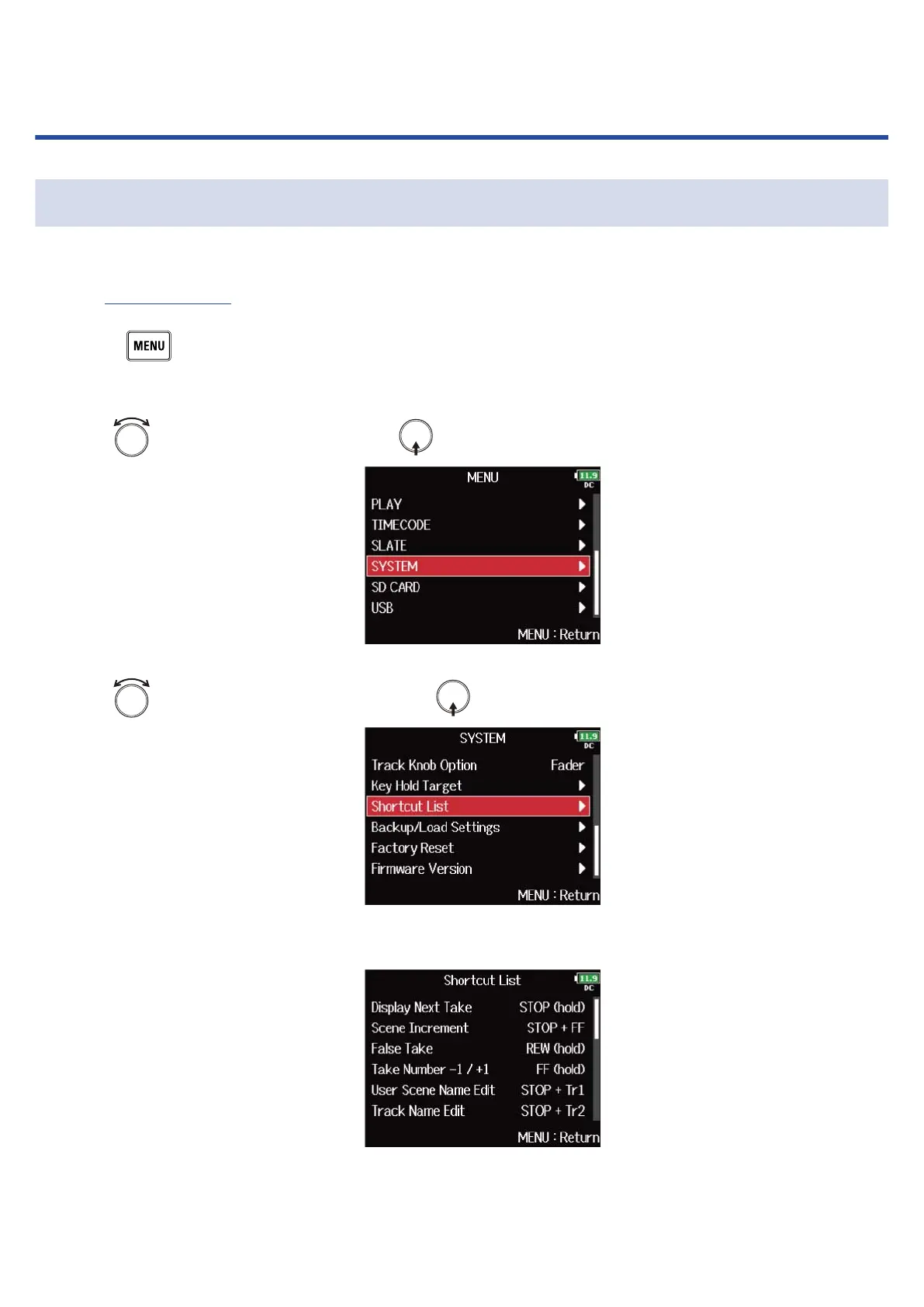3. Use to select “Shortcut List”, and press .