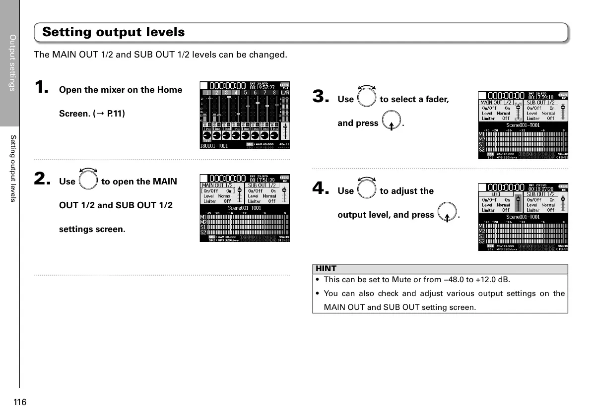 The MAIN OUT 1/2 and SUB OUT 1/2 levels can be changed.