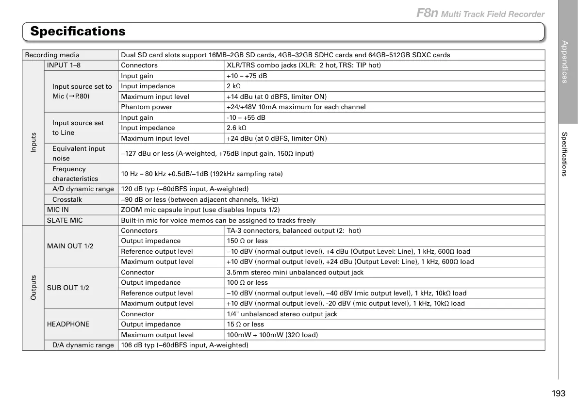 10 Hz – 80 kHz +0.5dB/−1dB (192kHz sampling rate)