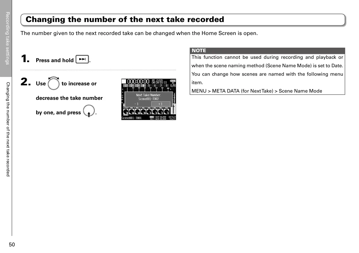 The number given to the next recorded take can be changed when the Home Screen is open.