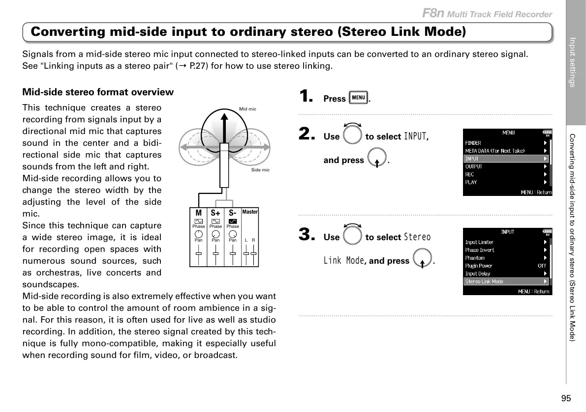 Signals from a mid-side stereo mic input connected to stereo-linked inputs can be converted to an ordinary stereo signal.