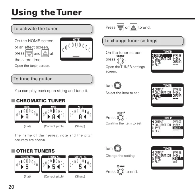 Zoom G1on - Using the Tuner; Activating and Tuning Guitar; Tuner Settings and Types