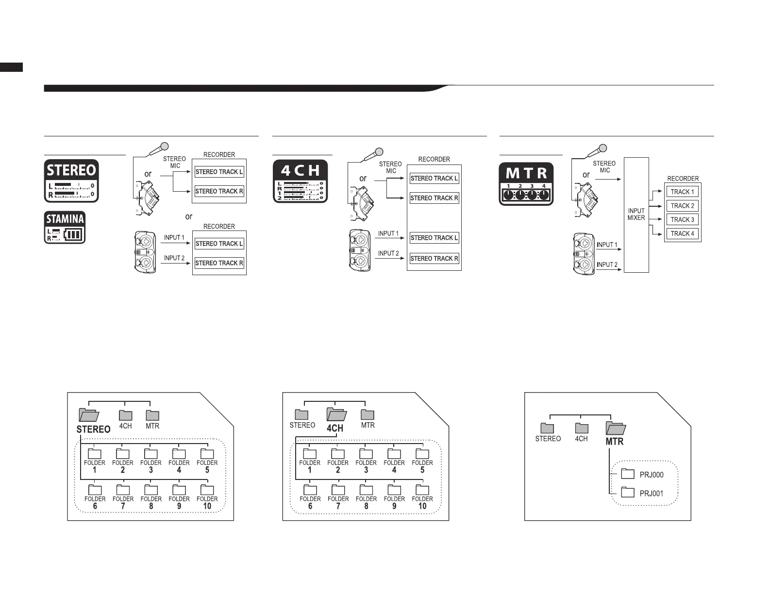 either INPUT MIC or INPUT 1 and 2, and record and