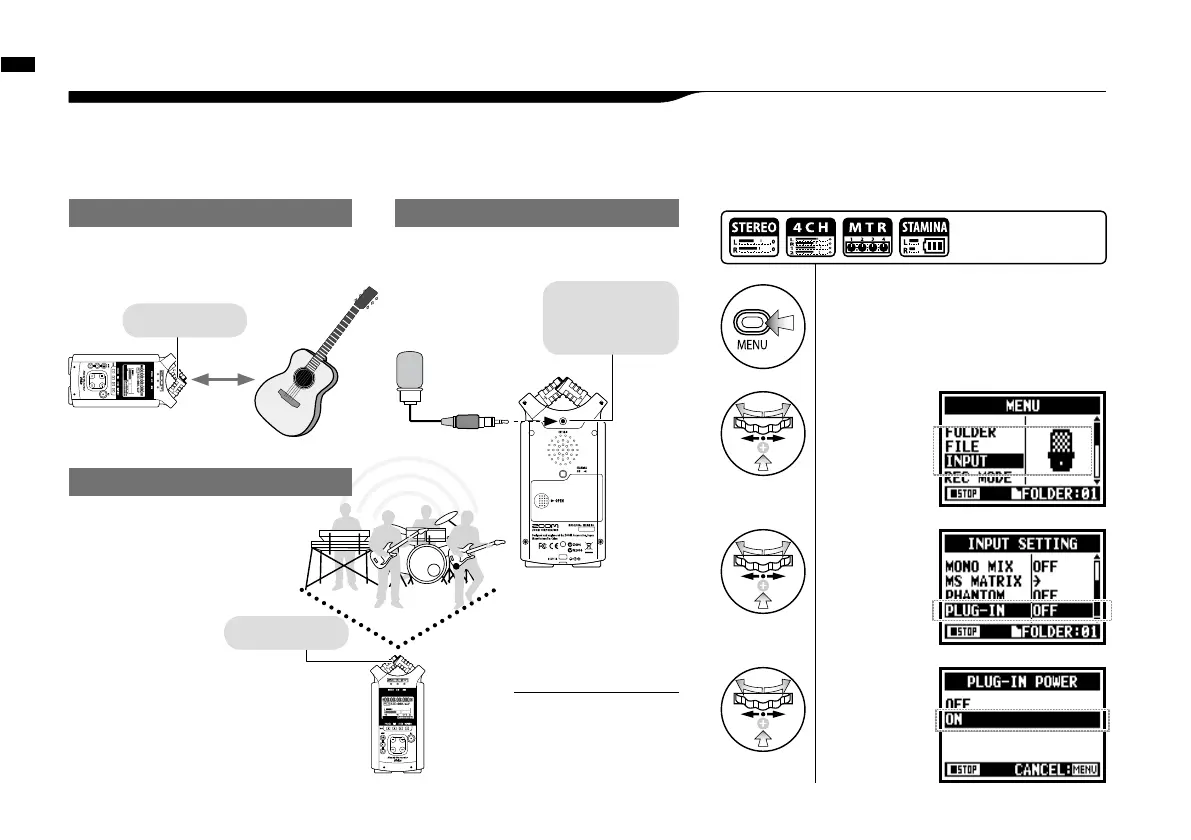 Setting up: Built-in microphones /outside microphone with plug-in power