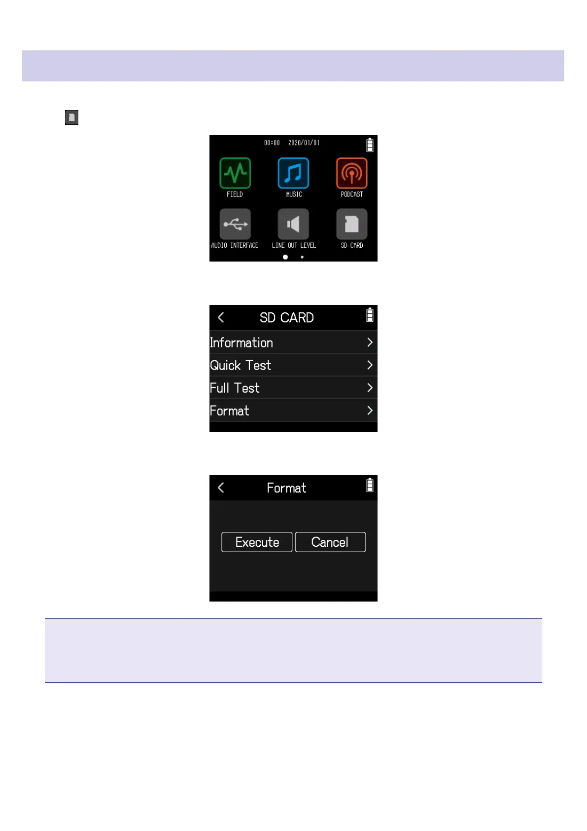 • All data previously saved on the SD card will be deleted when it is formatted. Please use caution.