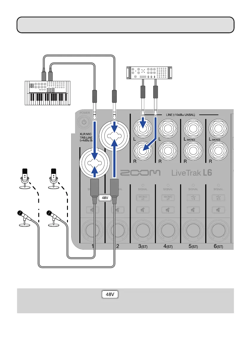 • When connecting condenser mics, press to supply phantom power.