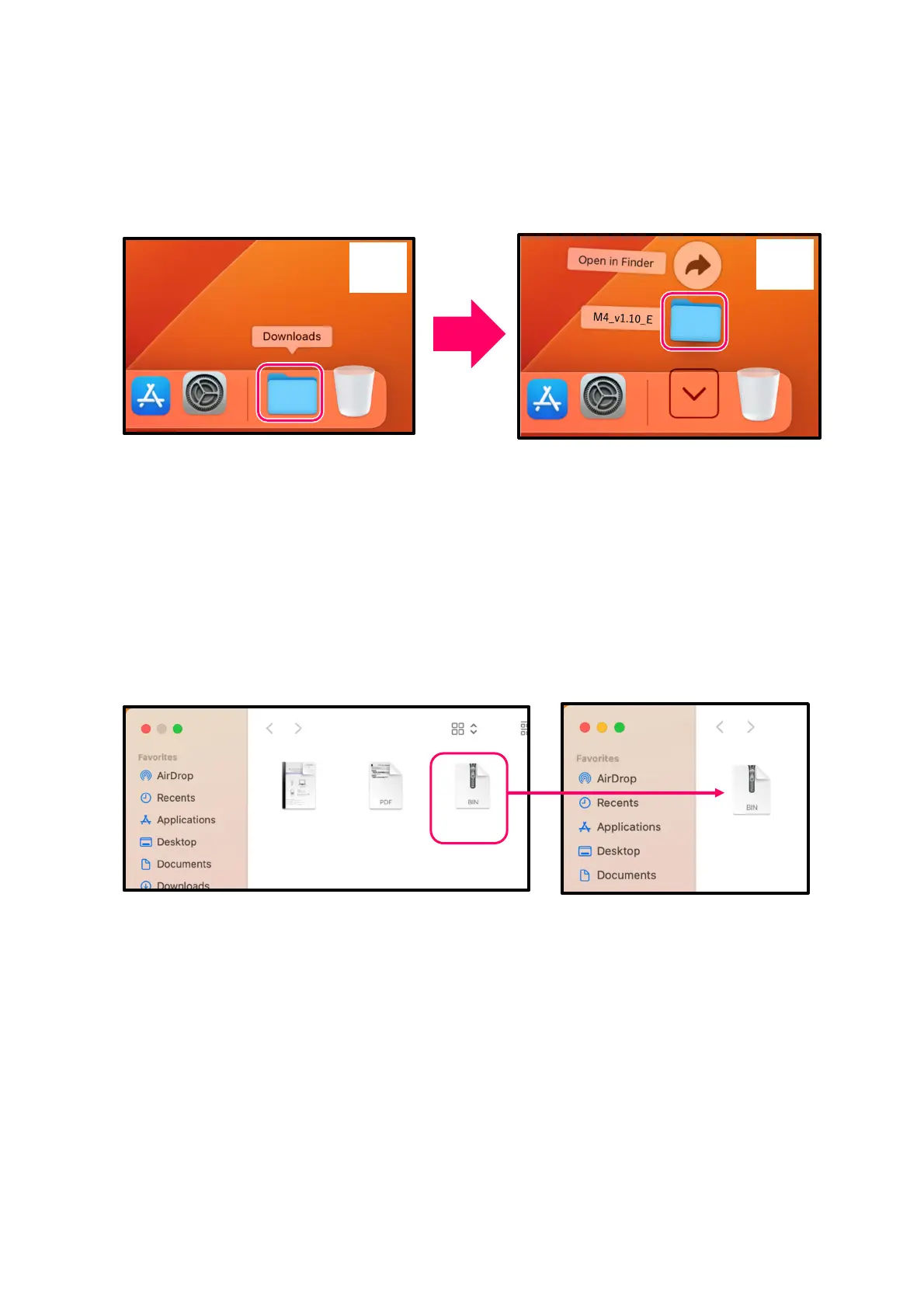 After downloading, open the ①“Downloads” folder which appears at the right end of the Dock by default.