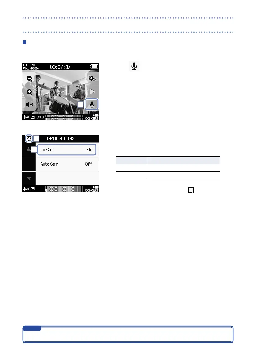 2. Touch Lo Cut on the INPUT SETTING screen, and change