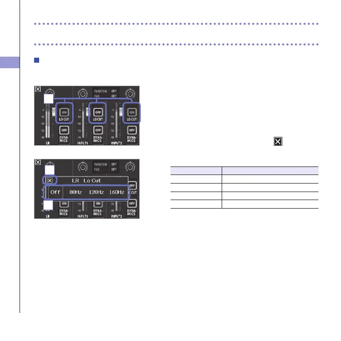 1. On the Mixer Screen, touch the "LO CUT" button for