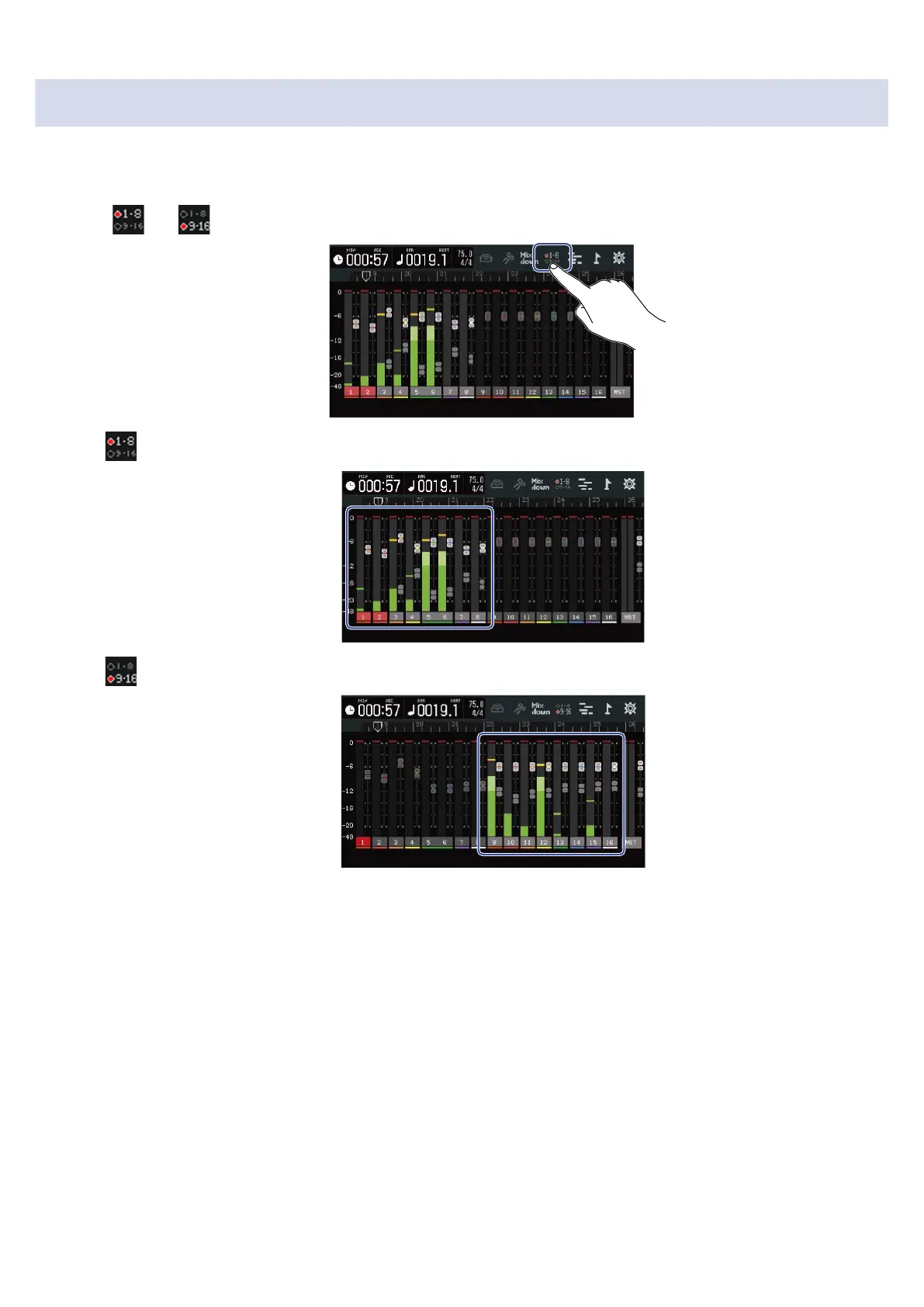The tracks that can be controlled by the physical faders (tracks 1–8 or 9–16) can be switched.