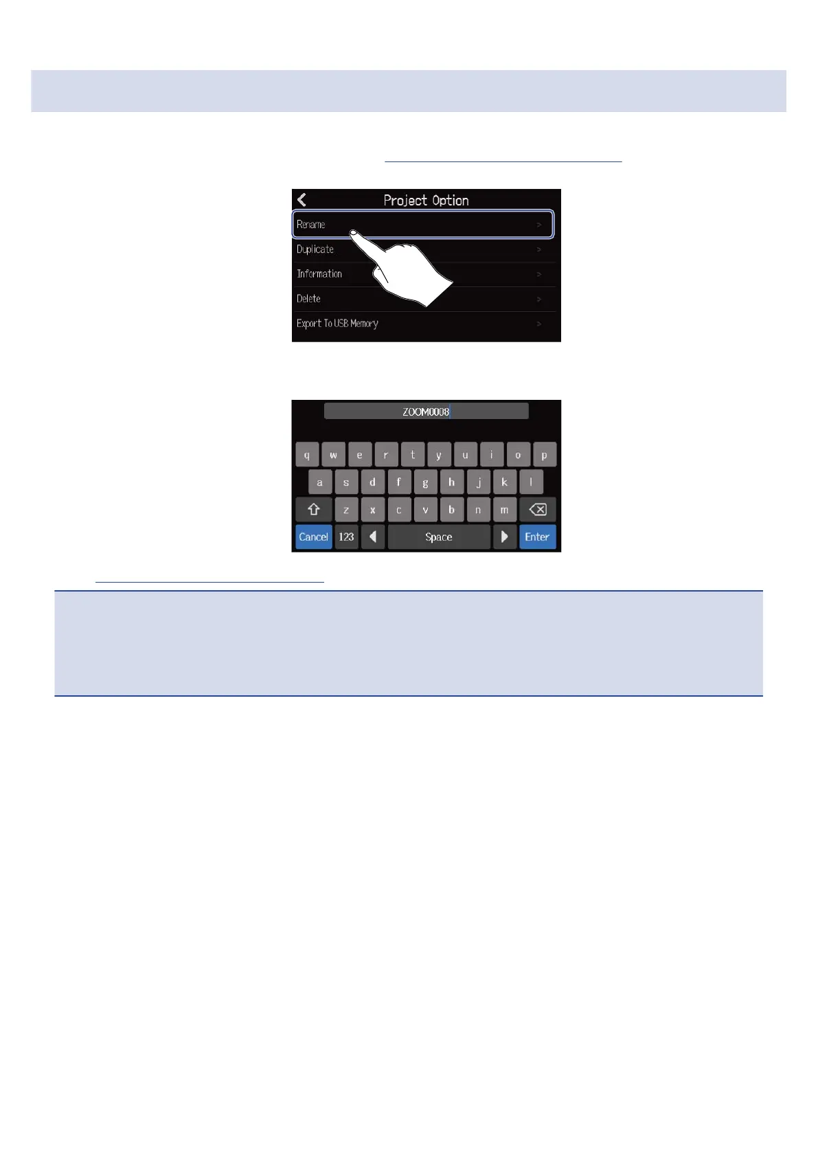 1. Tap “Rename” in the Project Option Menu (→ Opening the Project Option Menu) of the project that
