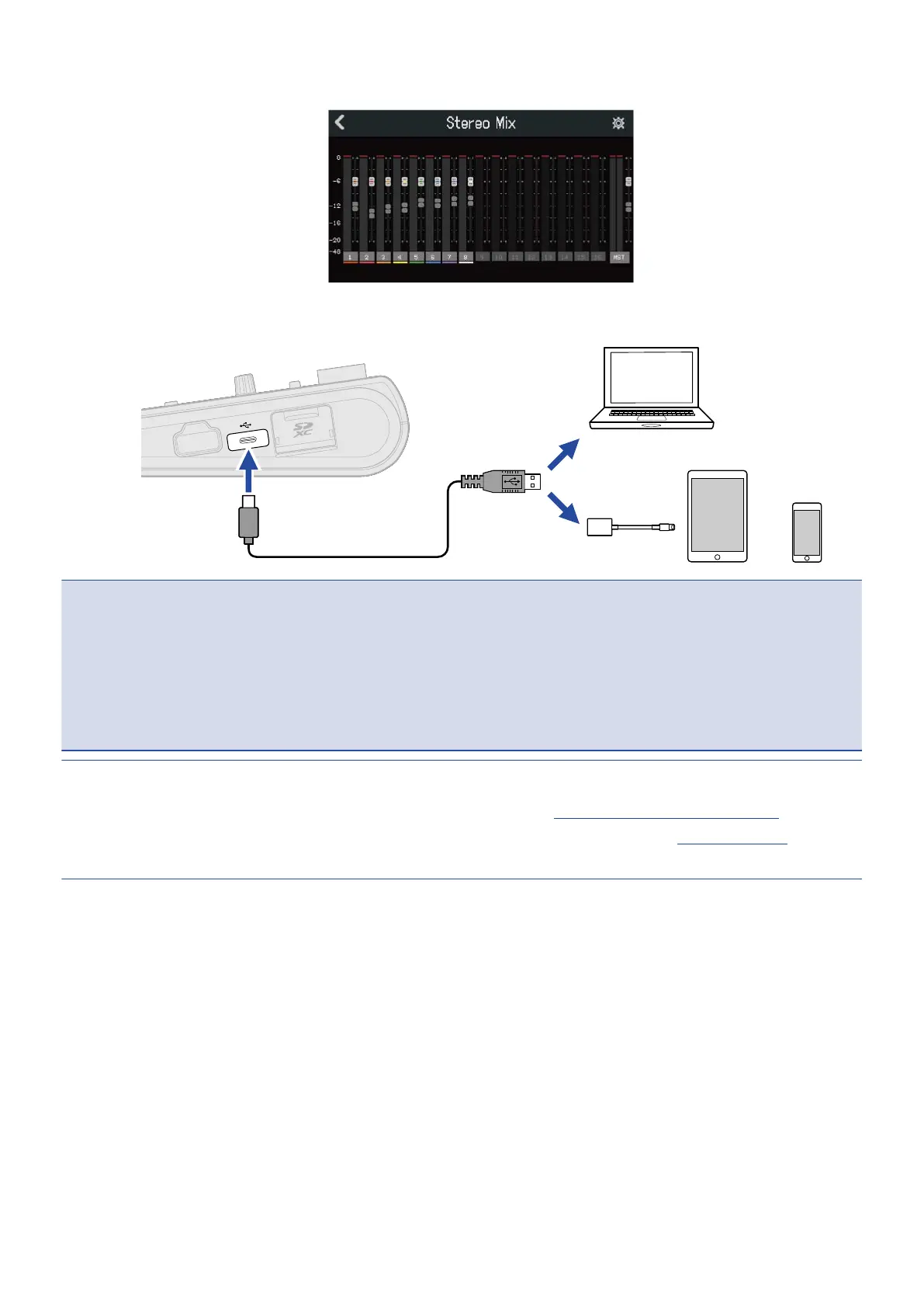 • When in Stereo Mix mode, the stereo signal mixed by the R20 is transmitted. See Mixing projects for