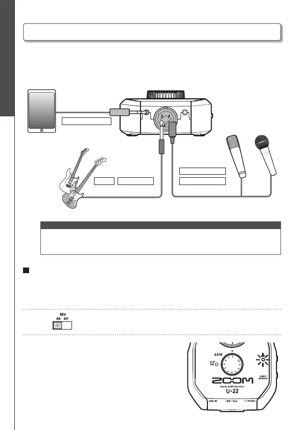 Use a mono instrument/XLR cable to connect an instrument or mic to the MIC/Hi-Z