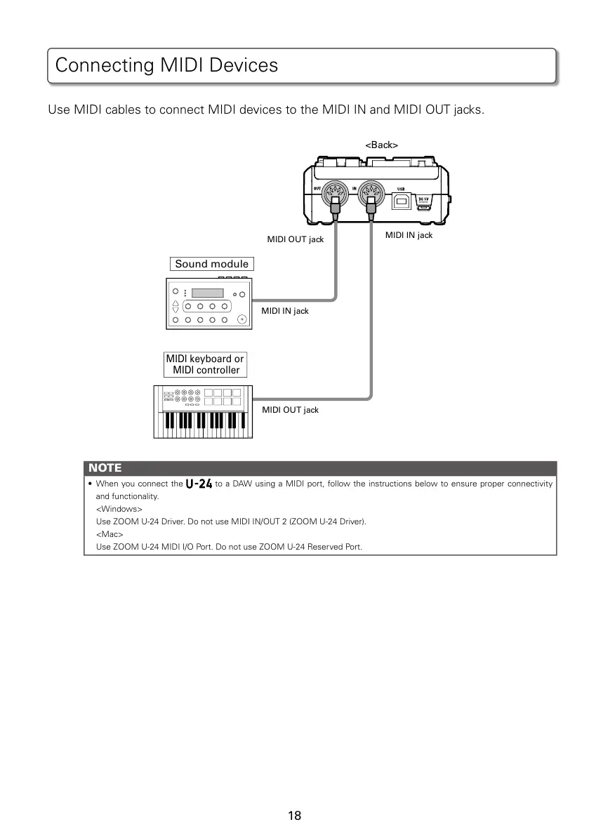 Zoom U-24 - Connecting MIDI Devices; MIDI Device Connection Procedures