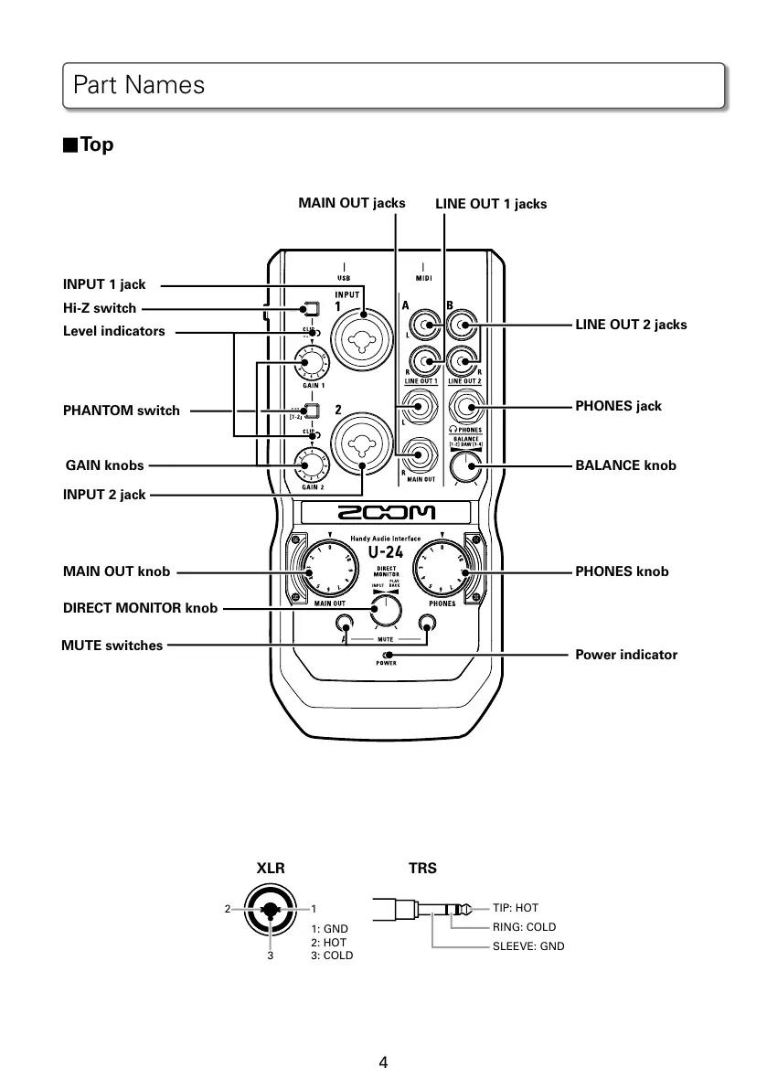 Zoom U-24 - ZOOM U-24 Part Identification; Top Panel Controls and Connectors