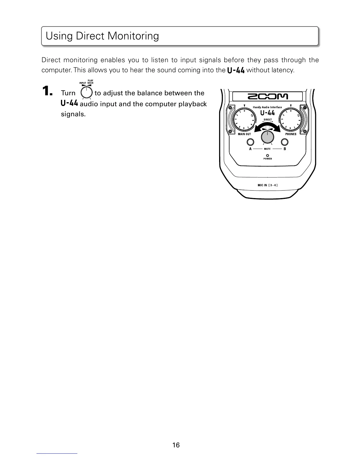 Zoom U-44 - Using Direct Monitoring; Direct Monitoring Adjustment