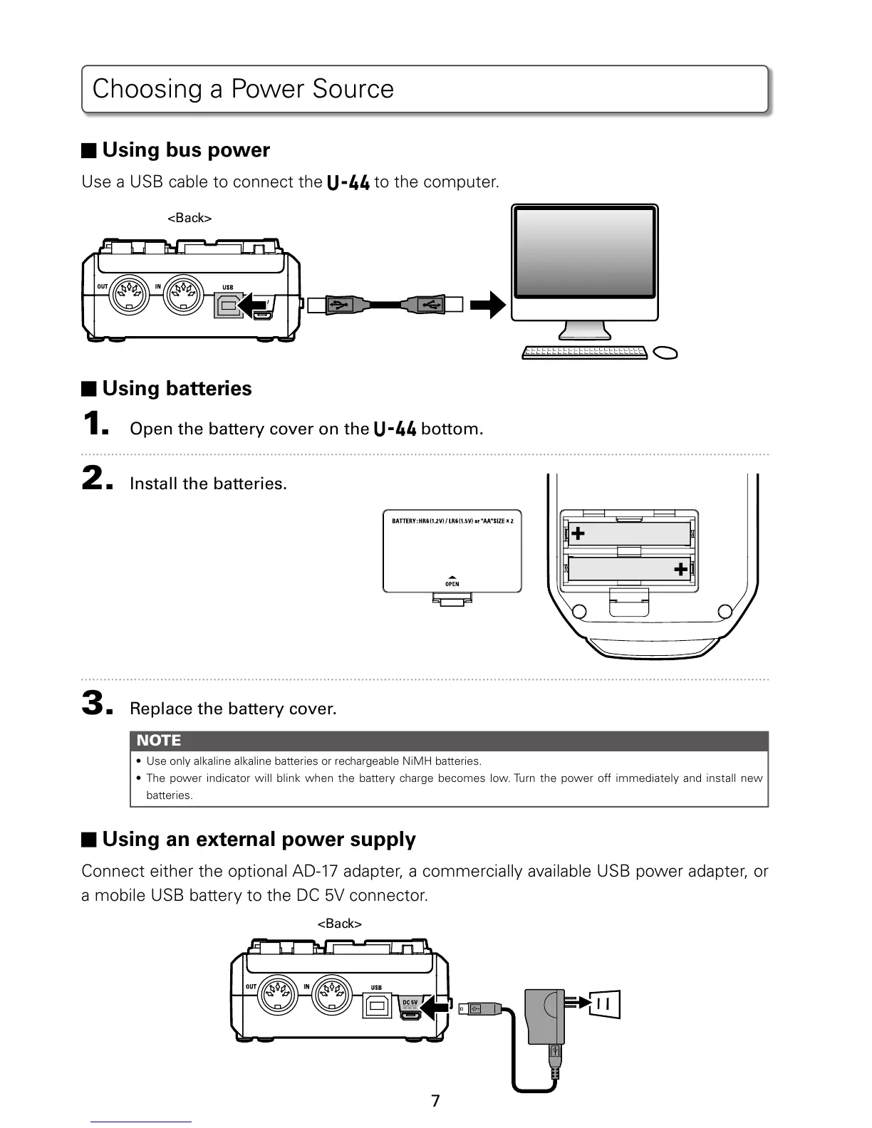 Connect either the optional AD-17 adapter, a commercially available USB power adapter, or
