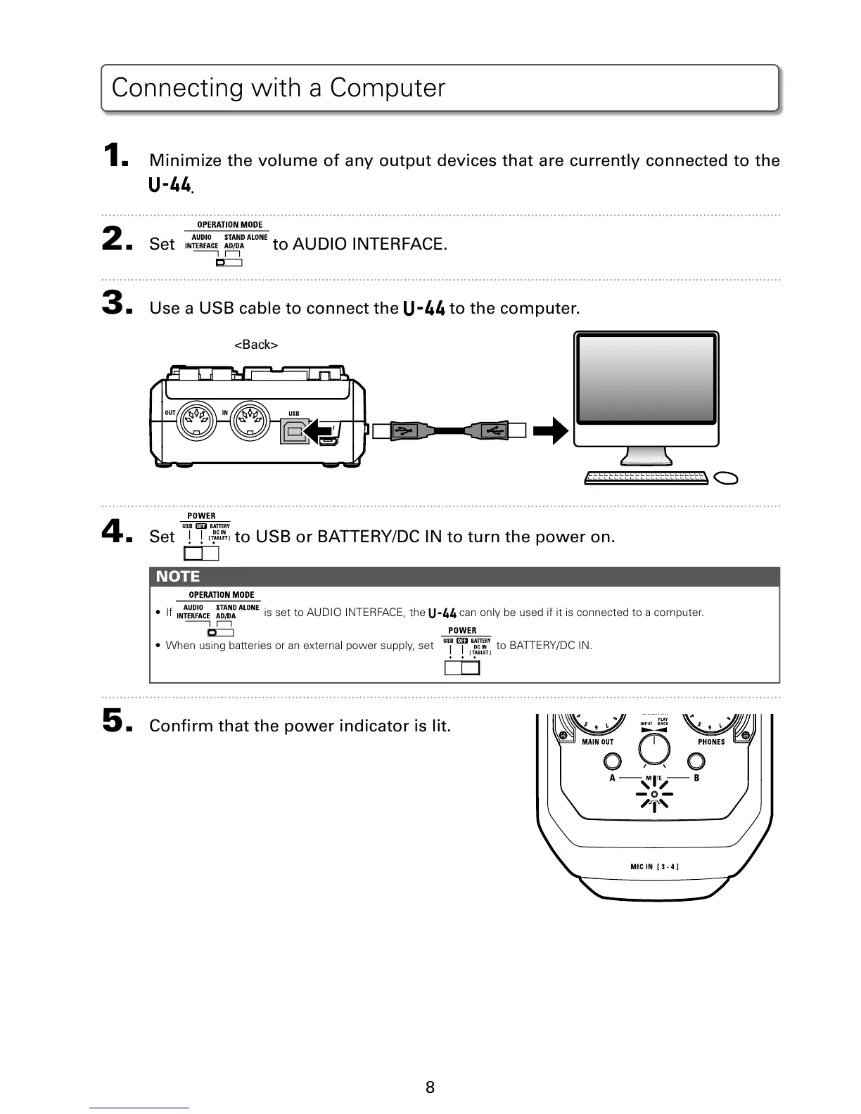 4. Set to USB or BATTERY/DC IN to turn the power on.