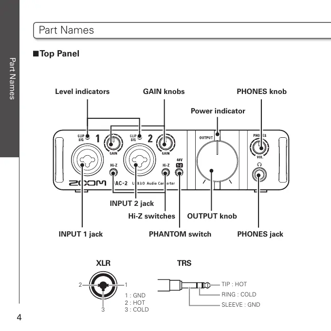 Zoom UAC-2 - Part Names Identification; Top Panel Components