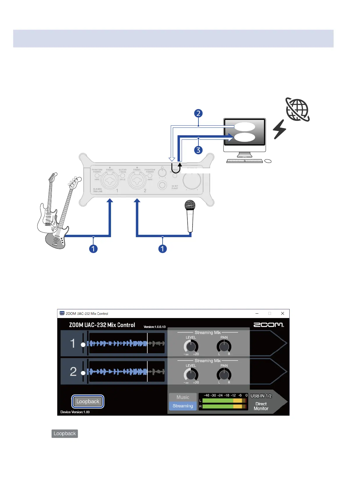 By turning on the Loopback function, sound input through the UAC-232 Input 1–2 jacks and sound output
