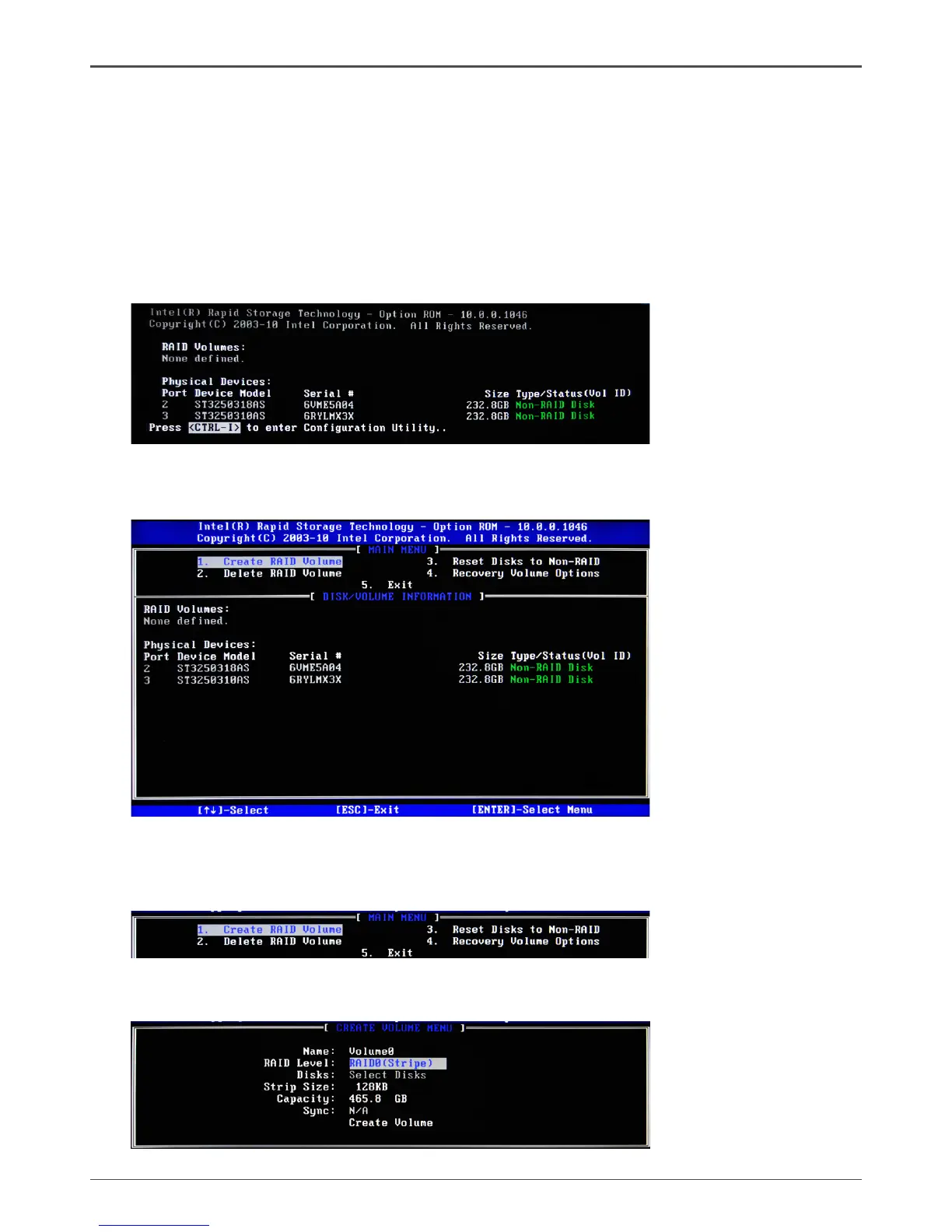 1. During POST, press <Ctrl-I> to enter the Intel(R) Rapid Storage Technology RAID BIOS