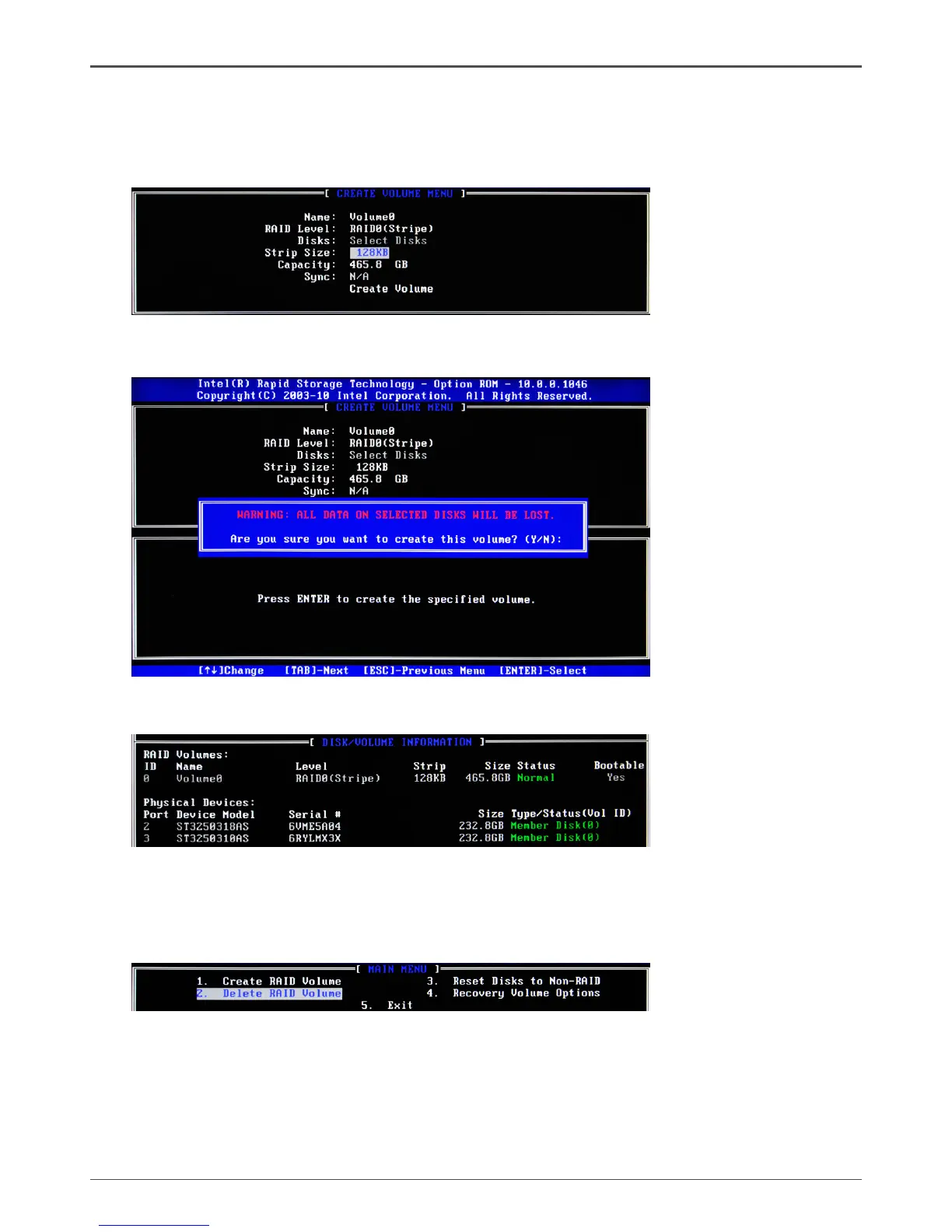 1. In the main Intel(R) Rapid Storage Technology RAID BIOS menu, highlight Delete RAID