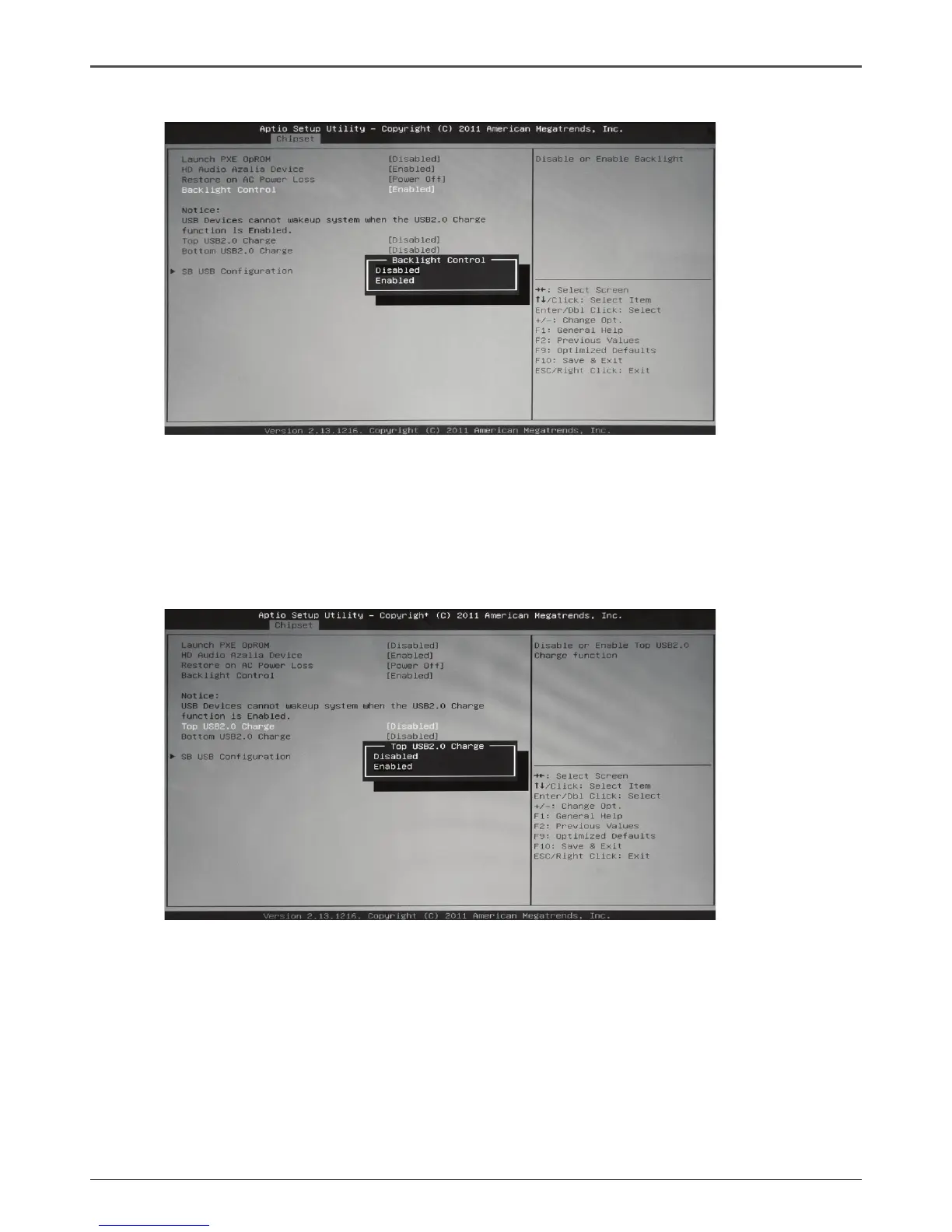 2. Use the arrow keys to enter the item Top/Bottom USB2.0 Charge, and