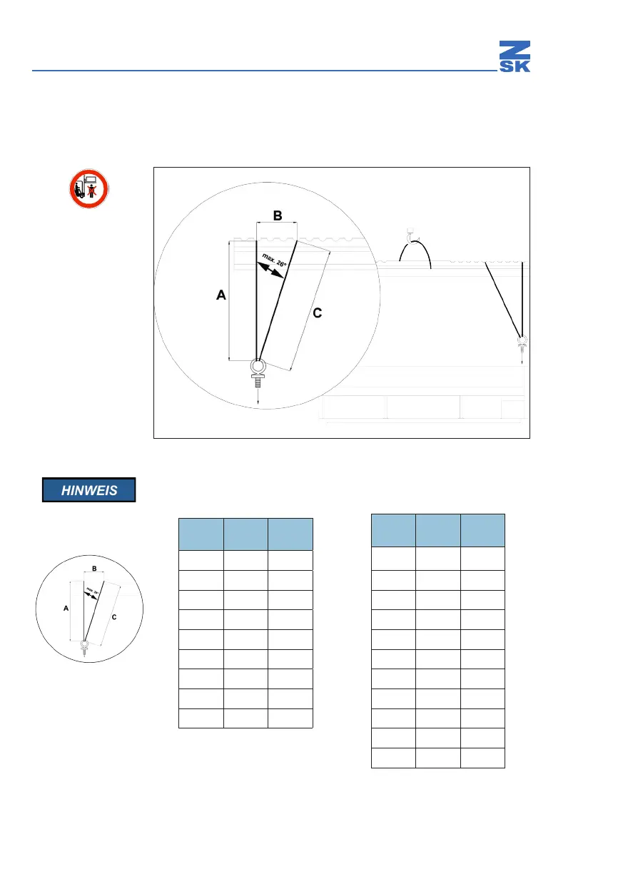 höchstens unter einem Winkel von 26° belastet werden. Für den Transport ist