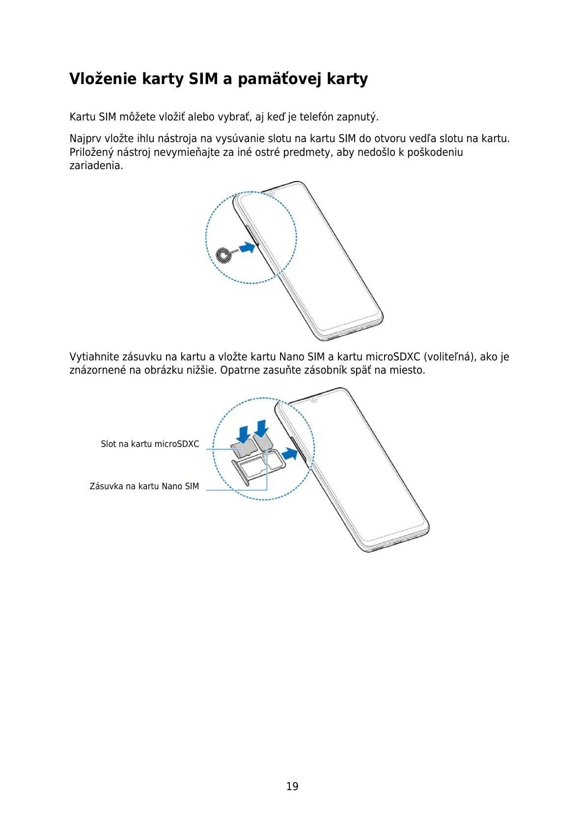 Vytiahnite zásuvku na kartu a vložte kartu Nano SIM a kartu microSDXC (voliteľná), ako je