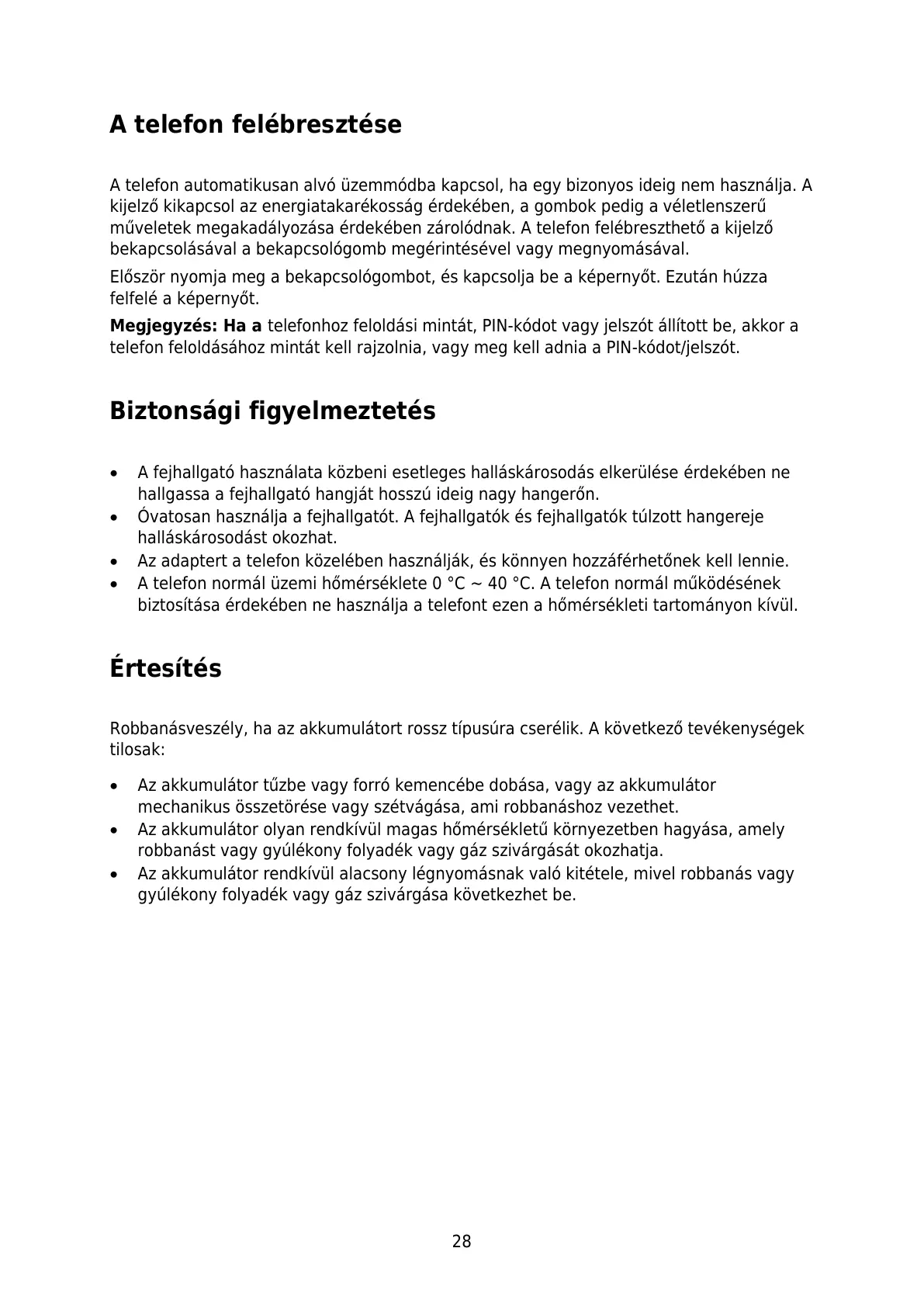 biztosítása érdekében ne használja a telefont ezen a hőmérsékleti tartományon kívül.