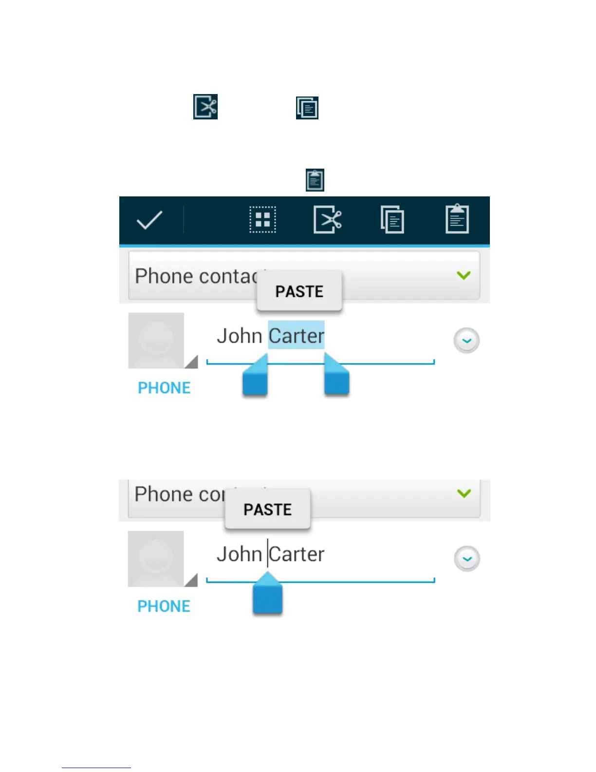 touch the Cut or Copy button to cut or copy the text