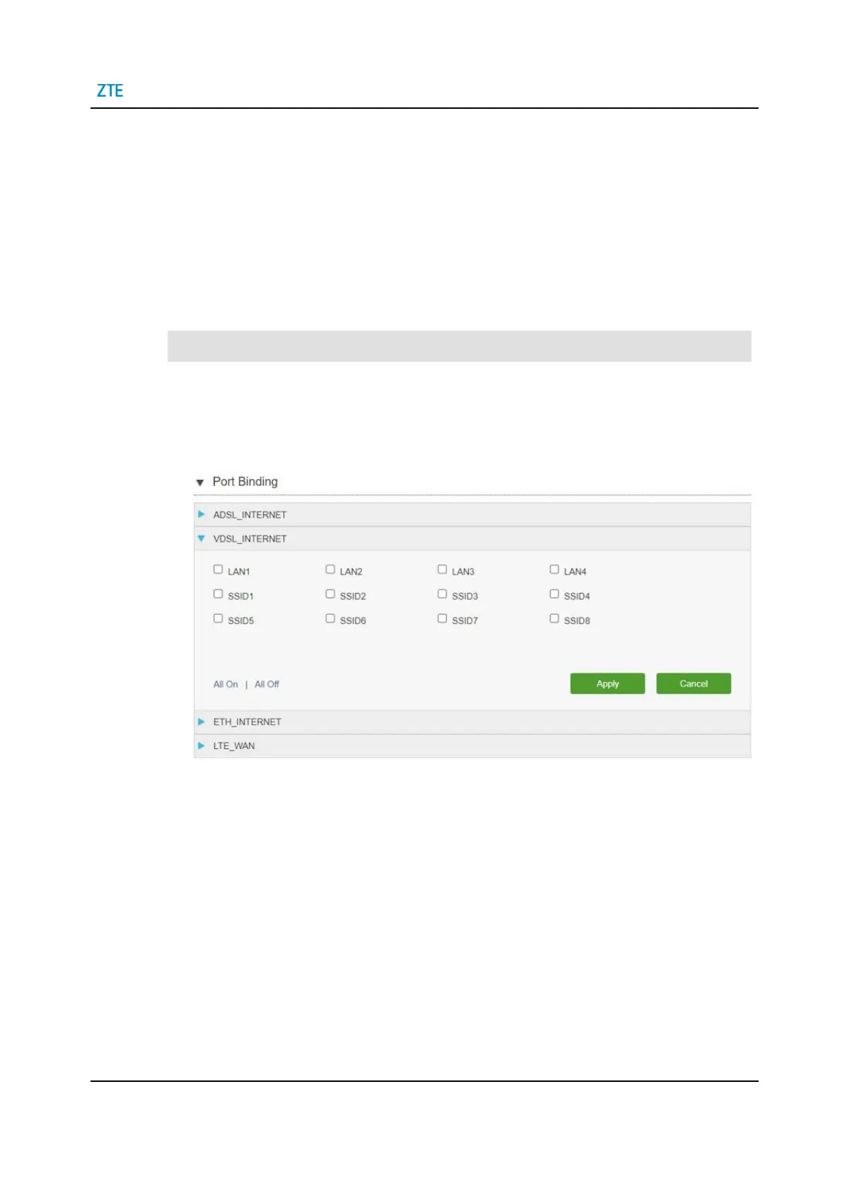On the main page of the ZTE H1600, select Internet > Port Binding to open the