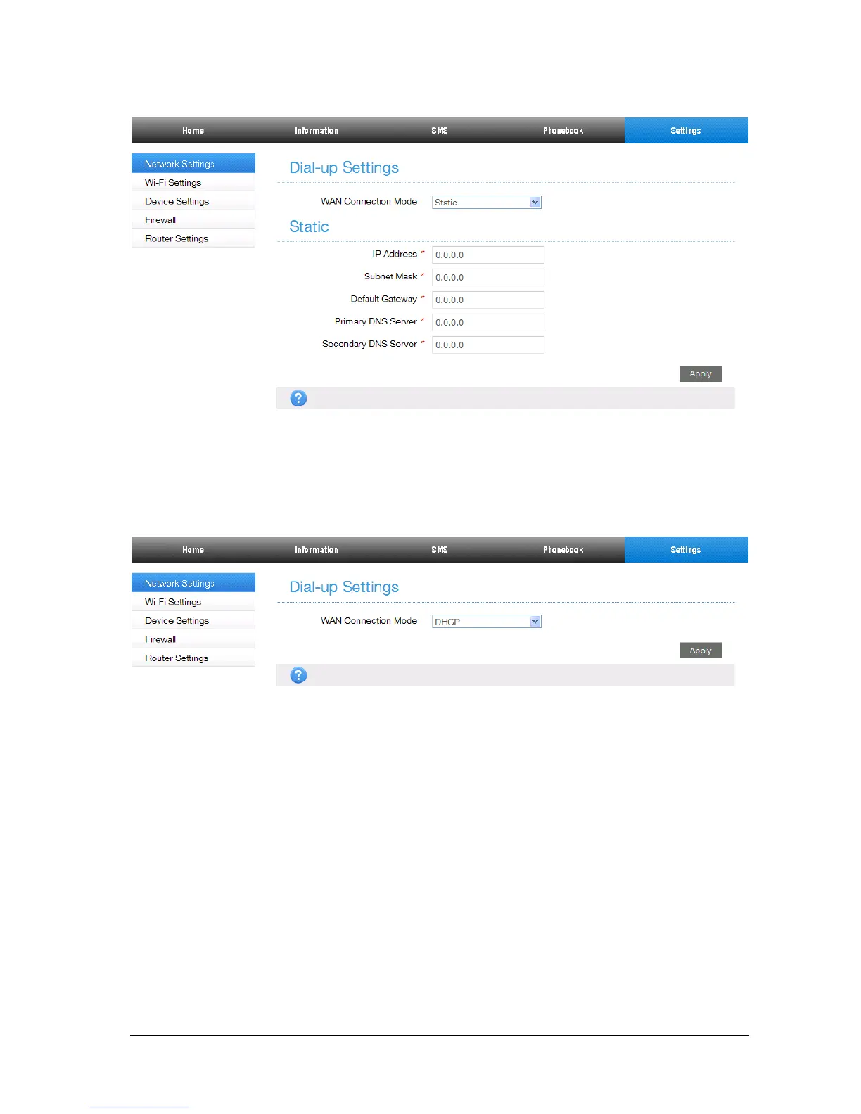 Select Settings > Network Settings > Dial-up Settings to change the WAN connection mode.