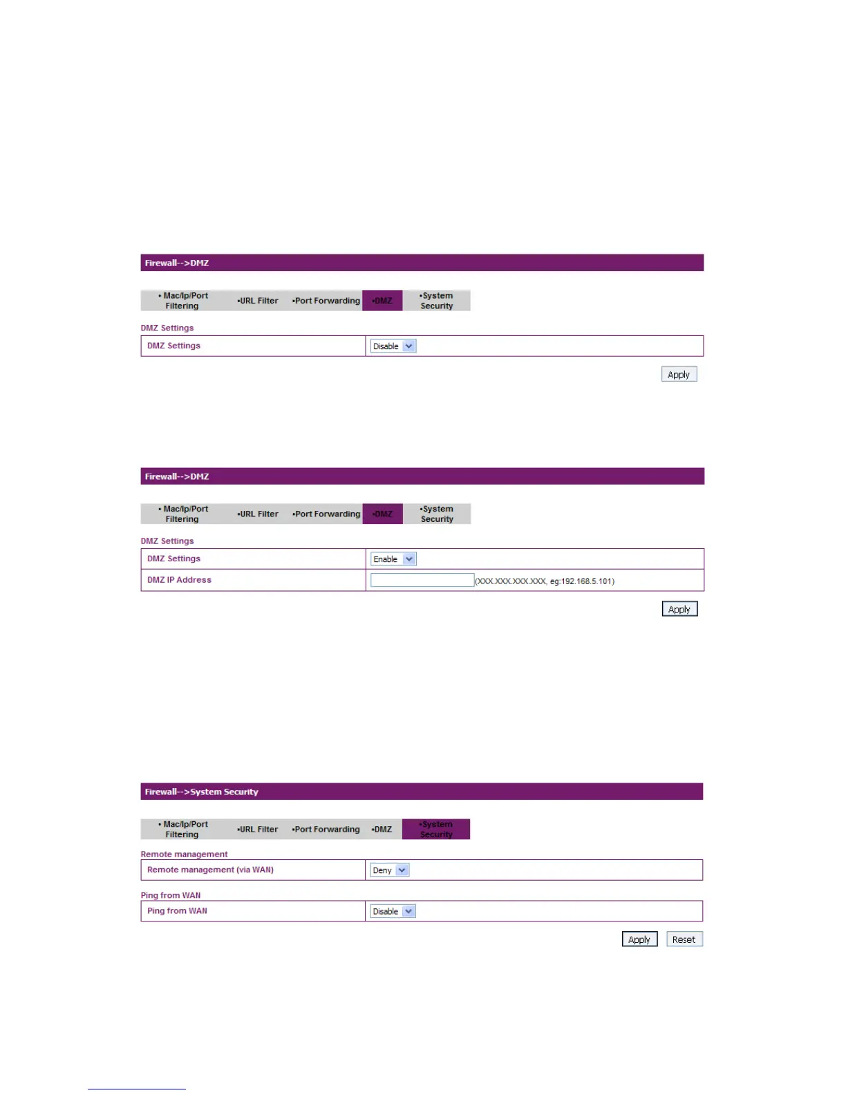network with the Internet. Select Firewall→DMZ, the DMZ setting is