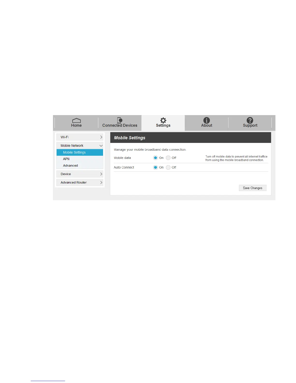 1. Select Settings > Mobile Network > Mobile Settings. The Mobile Settings page is shown in the