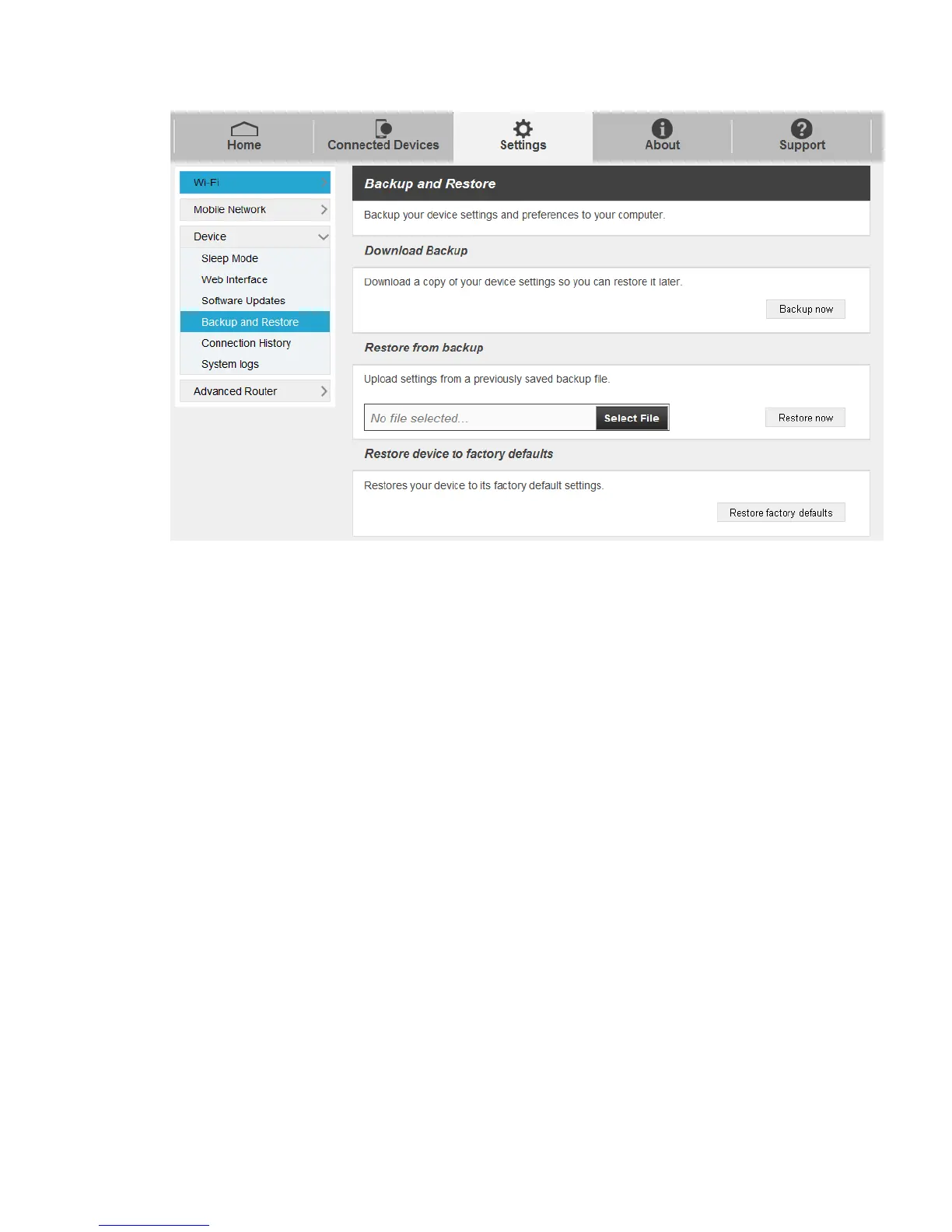 3. To restore your device to its factory default settings, click Restore factory default.