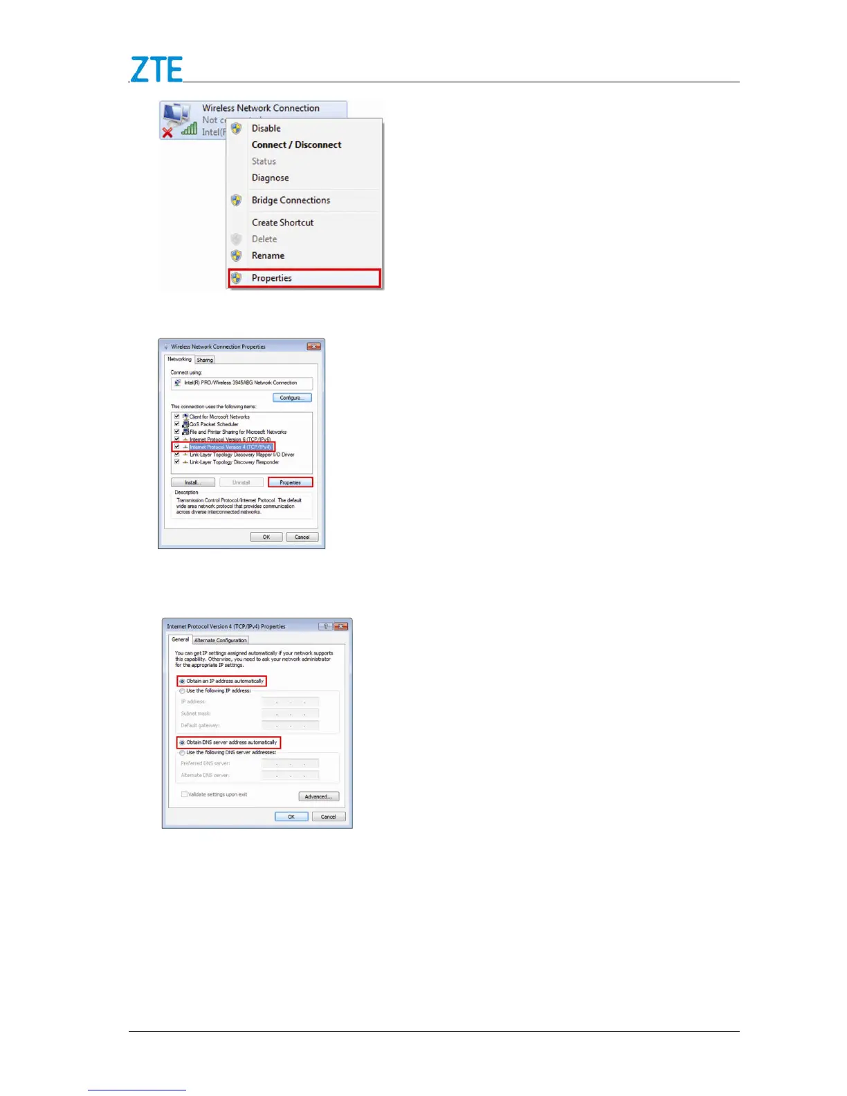 5. Select Obtain an IP address automatically and Obtain DNS server address