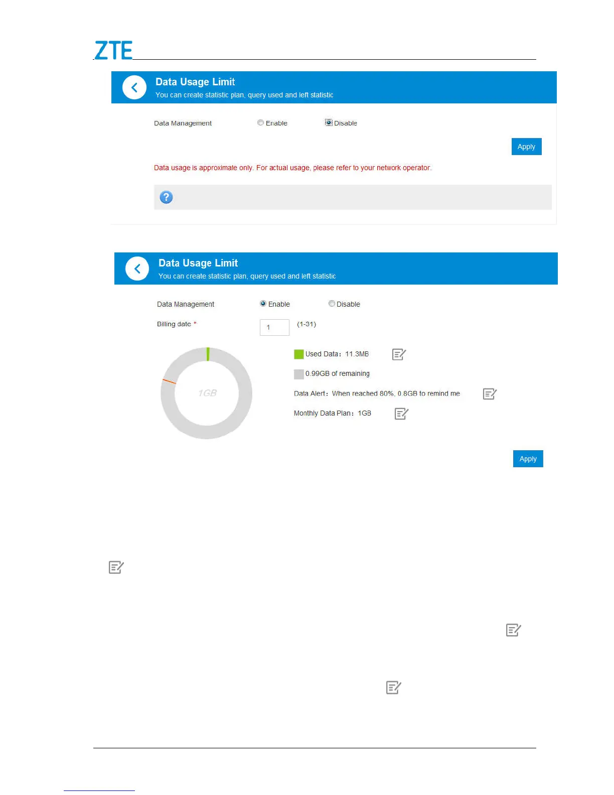 Monthly Data Plan: Set mobile data usage limit. Click to adjust the parameters.
