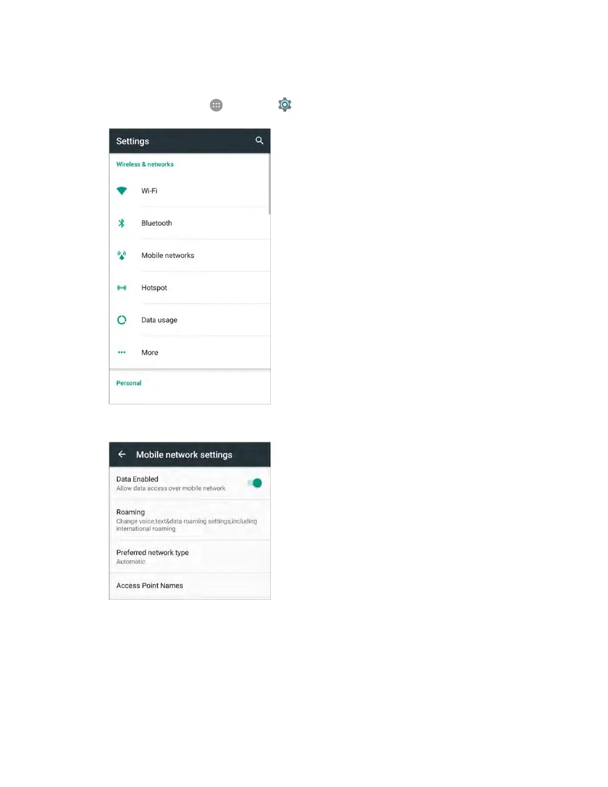 1. From home, tap Apps > Settings > Mobile networks.