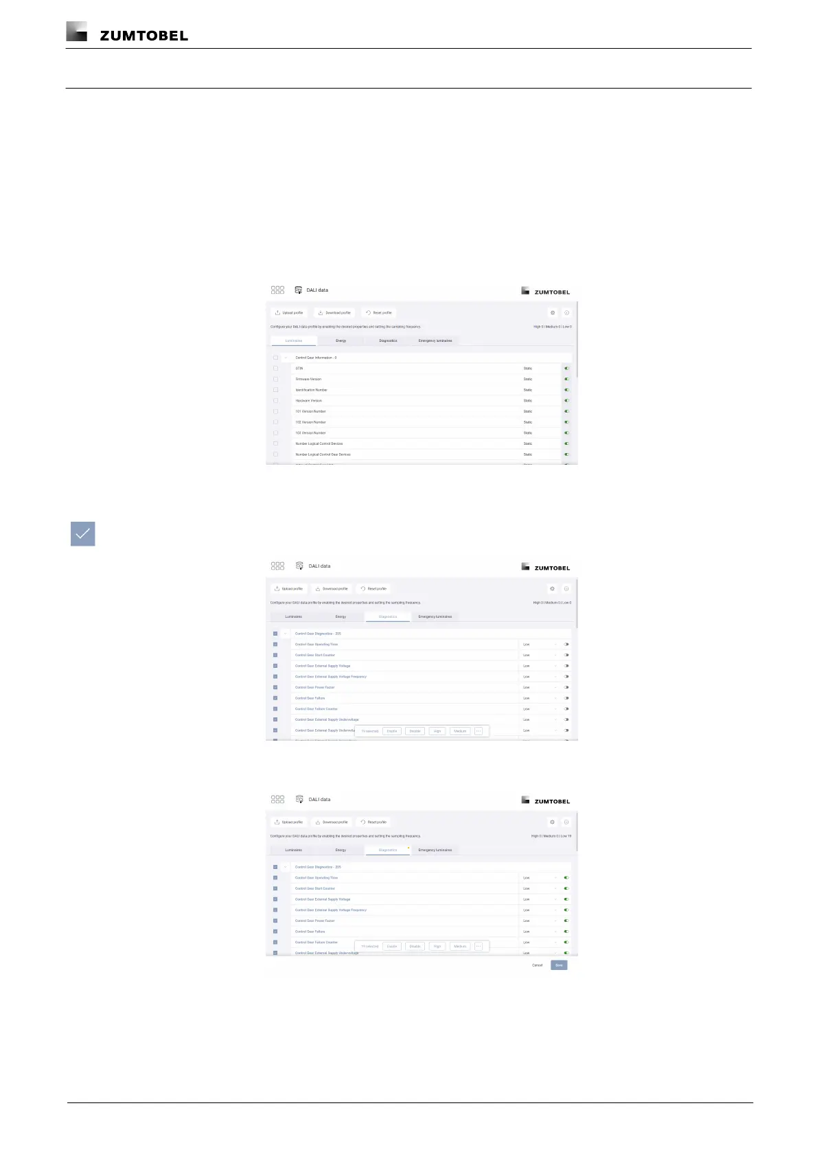 2. Tap the tab (Luminaires, Energy, Diagnostics, Emergency luminaires) to view