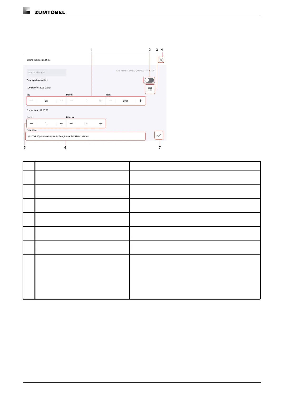 Table 20: Functions in the “Date and time” app when time synchronisation is disabled