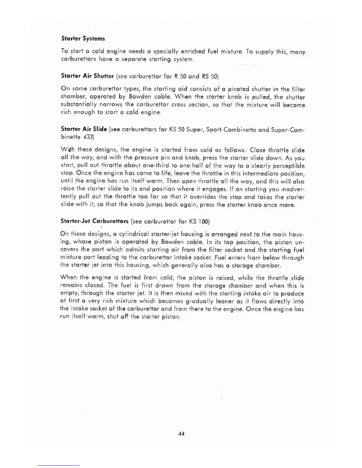 Zundapp 100 cc - Starter Systems; Starter Air Shutter; Starter Air Slide; Starter Jet Carburetor