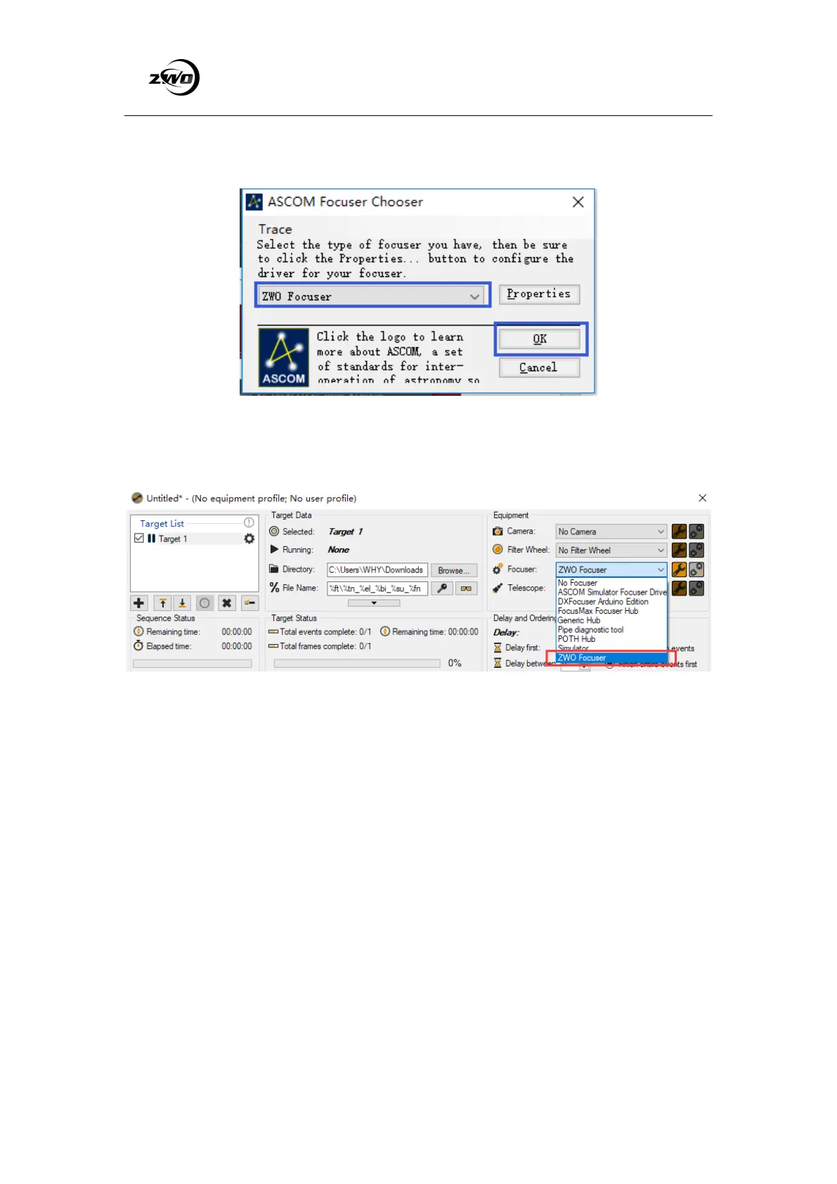 3. Choose ZWO Focuser in ASCOM panel.