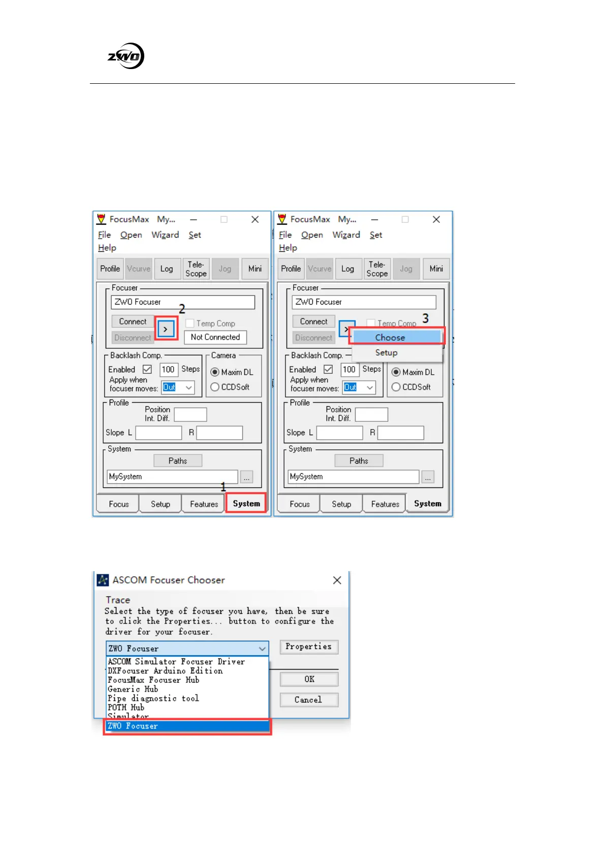 Step 2: Select the ZWO Focuser in the dialog and click OK.